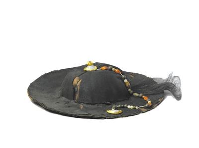 這一頂鑲寶石鈸笠帽,可要豪華貴重得多,這是一頂帽頂垂有一串玉石珠串飾的帽子,帽的直徑有35厘米。《大元典章》曾記載有人搶走蔡國祥懸有紅瑪瑙珠串的棕帽的事??梢娒鄙洗勾椧彩窃F族的風(fēng)氣。這種帽子的流行始于元成宗大德年間(1297—1307),一個商人賣給官府一塊紅剌子(紅寶石)重一兩三錢,用于鑲嵌帽頂。從此以后,歷代皇帝相承。凡元旦及天壽節(jié)大朝賀時都戴這種鈸笠帽。漳縣元代汪世顯墓出土的這頂鈸笠帽,帽頂鑲金裹玉,由帽頂垂系31顆珠玉組成的串練。以珠玉寶石來裝飾帽子,帽子的價值之高昂自不待言。