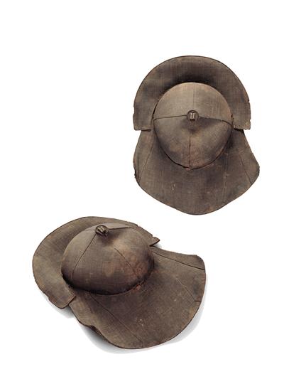 先看前加沿笠帽,大家看是不是有些眼熟?沒錯,這頂帽子與影視劇中英雄俠客們所戴的帽子很相似,《神探狄仁杰》里的李元芳、《水滸》中的林沖外出時就戴類似的帽子。為什么要戴這樣的加沿笠帽呢?為了遮光啊。別小瞧這頂前加沿笠帽,它的背后還有一段歷史故事呢:相傳元世祖忽必烈騎馬射獵時覺得日光太過炫目,聰慧體貼的皇后便為他設(shè)計了這種前面加沿的帽子,戴這種加沿帽遮光效果就好多了,忽必烈非常喜歡,便將這種式樣固定了下來,以后國人紛紛效仿,成為流行款式??墒牵扑问窃谠?,元芳和林沖似乎不該戴類似的帽子?既是藝術(shù)形象,就不用深究了吧。人類智慧相通,英雄更是惺惺相惜,既都是英雄,戴上同款的帽子也是應(yīng)有之義。