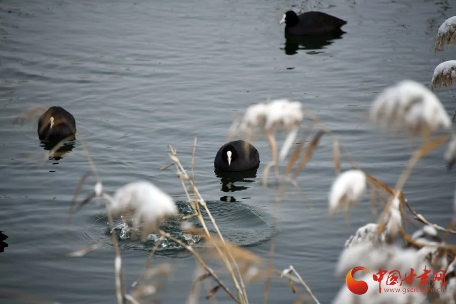 黑白相間的珍禽點綴尚未結冰的湖面