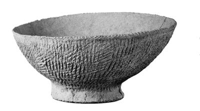 甘肅省博物館展出的一只大碗,和牛肉面大碗基本一樣。造型完全相同:圓口,口大而底小,大約一指頭寬的碗底,人們稱之為碗足。從碗足開始,逐漸擴(kuò)展,直到碗口。不同的是,這只八千年前的碗上有大量的繩紋,是用夾砂陶燒制而成的。