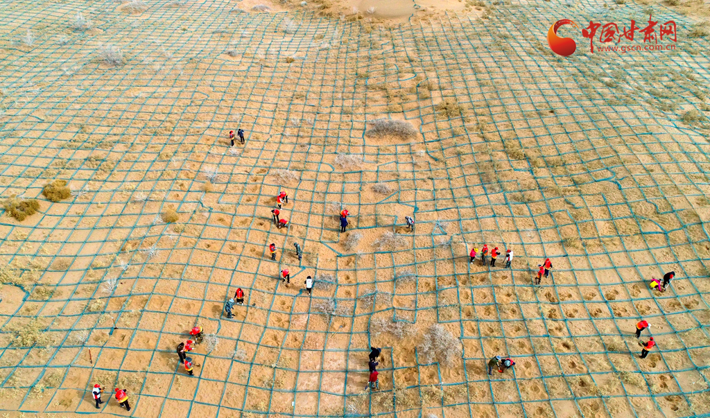 3月12日,市民在筑牢阻沙網(wǎng)和種植梭梭。(無(wú)人機(jī)拍攝)
