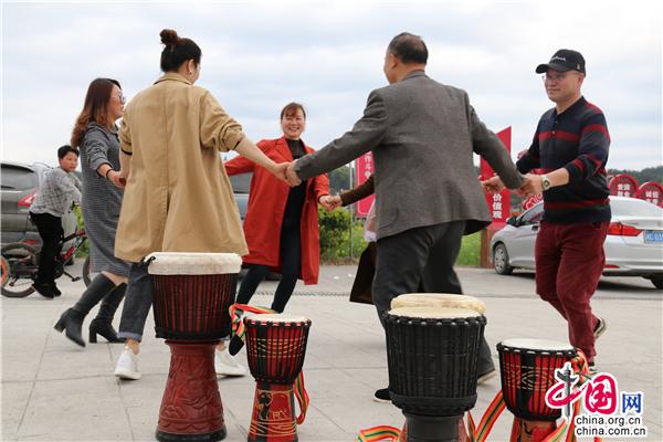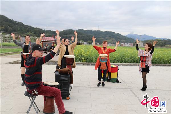 3月22日中午,湖南省隆回縣司門(mén)前鎮(zhèn)學(xué)堂灣村,文化志愿者教村民打手鼓、跳舞,吸引一旁踏青的游客前來(lái)觀摩。