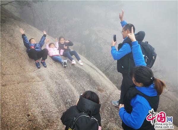 在得知蓮花峰關(guān)閉四個月后重新開放,上海游客宋先生和朋友專程來黃山爬蓮花峰,他說:“云霧時隱時現(xiàn),仿佛置身于仙境之中。登頂以后,看到蓮花峰非常高聳,非常壯觀,感覺到心神愉悅。”