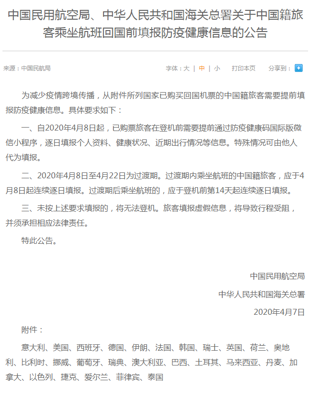 中國民用航空局、中華人民共和國海關總署4月7日聯(lián)合發(fā)布《關于中國籍旅客乘坐航班回國前填報防疫健康信息的公告》(以下簡稱《公告》)?!豆妗分赋?,自4月8日起,從意大利、美國、西班牙等26個國家已購買回國機票的中國籍旅客需要在登機前提前填報防疫健康信息,包括逐日填報個人資料、健康狀況、近期出行情況等。旅客未按要求填報的,將無法登機;填報虛假信息,將導致行程受阻,并須承擔相應法律責任。