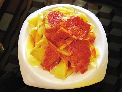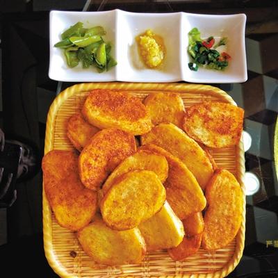 炕鍋洋芋是臨夏農(nóng)家樂里面常見的一道特色小吃,在臨夏,煎、烙之類的烹飪方式都被稱作炕,炕鍋洋芋因此得名。洋芋切片后,直接放熱油中兩面煎透??诲佈笥蟮淖龇m不復(fù)雜,但其對(duì)于火候的要求卻極其嚴(yán)苛,多一分會(huì)焦,少一分則不熟。
