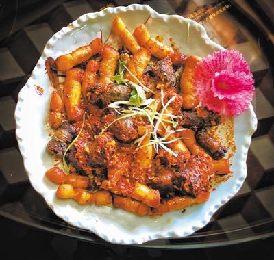 這道美食曾上過《舌尖上的中國(guó)》,它的神秘感來(lái)自于食材:發(fā)子色澤暗紅,面腸通體白凈,配以鮮紅的辣椒油,色澤亮麗,風(fēng)味獨(dú)特。發(fā)子是將新鮮羊心、羊肺、羊肉剁碎,拌以蔥、油、調(diào)味品,撒以適量面粉,制成餡子,裝入羊腸中,入火蒸好后,切段入盤。面腸以面粉為主料,配以調(diào)味品,灌入羊小腸中,放入蒸籠約蒸15分鐘,中間須針刺泄氣,以防破裂,熟后切段入盤。按臨夏習(xí)慣,發(fā)子面腸組合成一道菜,盤底放面腸,上面放發(fā)子,再放入辣椒油、蒜泥、香醋等即可享用。