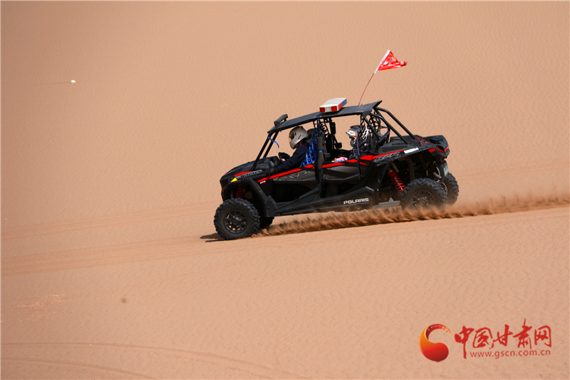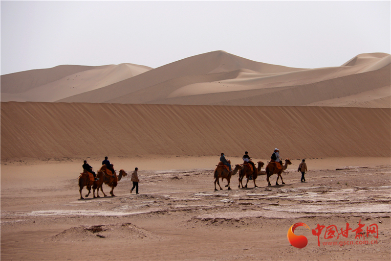 5月19日,游客在甘肅省敦煌市鳴沙山月牙泉景區(qū)游覽。