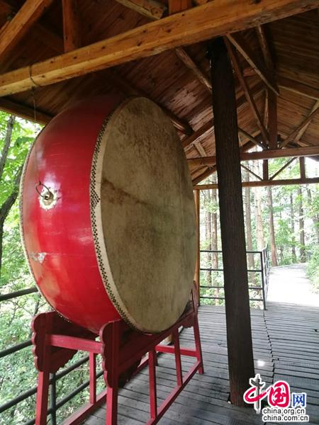 不知是何等神力相助,我竟然氣不急喘,腿不灌鉛,一口氣沖到了大鐘處。在一處長約兩百米,寬約五六米的突兀石崖下,竟然有一條長百米寬約三米的平坦棧道,直抵懸崖石壁,仿佛一條地道的天街。從懸崖上吊掛下來一尊重達(dá)千斤的銅鐘,鐘邊吊一根木質(zhì)鐘錘,錘身已裂開,兩頭均被撞成起毛的“絨團(tuán)”,由此可知,到達(dá)此處撞鐘的勇士并非少數(shù)。我乘興上去重重地撞了九下,雄渾、恢弘的鐘聲,在峽谷上空久久地回蕩。