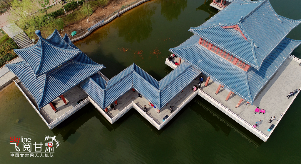 這是4月14日在蘭州市雁灘公園航拍的圖片,一湖碧水,滿園春色。