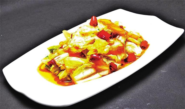 酸辣白菜的食材要選上等的大白菜,剝?nèi)ネ鈱永先~當(dāng)主料。老姜去皮,優(yōu)質(zhì)紅朝天椒泡軟,川椒過熱水,以白糖、米醋、味精、香油等為輔料。先把白菜切細(xì)條,放入微量鹽,拌勻腌制四五個(gè)小時(shí)后,在涼開水中過一下,撈出控水,放至微蔫。這時(shí),起炒鍋開火,冷油放入辣椒、花椒、蔥絲、姜絲,慢慢煎至微微發(fā)黃散出香味時(shí),將油潑在白菜上,最后放入白糖、米醋、味精等拌勻,就大功告成了。