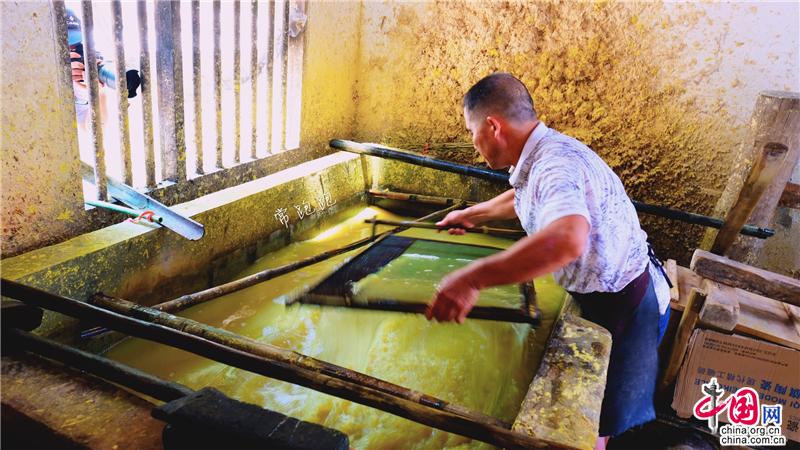 隆回縣灘頭鎮(zhèn)桃林村手工抄紙作坊,已經(jīng)成為一處著名的文旅項(xiàng)目景點(diǎn)。走進(jìn)陶林村,一棟棟青瓦石墻的新屋吸引了人們的目光。屋外山坡竹林茂密,山溪流水潺潺,屋內(nèi)手工抄紙制作的原料、工具布置的次序井然,手工抄紙的全套工藝流程在這幾棟屋中得以完整體現(xiàn)。手工抄紙技術(shù)歷史悠久,始于隋唐,至明朝時(shí)抄紙已經(jīng)非常盛行。上世紀(jì)八十年代鼎盛時(shí)還曾遠(yuǎn)銷東南亞和日本。非遺傳承人李志軍今年61歲,自稱“紙蟲”,帶領(lǐng)著全家人承襲著祖宗留下的獨(dú)特技藝。而支撐著李志軍的堅(jiān)守的,是隆回縣文旅部門的巨大付出和努力。2011年,他們支持李志軍建立了手工抄紙標(biāo)準(zhǔn)化作坊,2016年又對(duì)該作坊進(jìn)行擴(kuò)建,使之成為國(guó)家級(jí)非遺項(xiàng)目。灘頭手工抄紙作坊占地面積1714平方米,是灘頭手工抄紙有史以來最大的作坊,同時(shí)也是集生產(chǎn)、創(chuàng)新、傳承、展示、研學(xué)為一體的重要基地和文旅基地。
