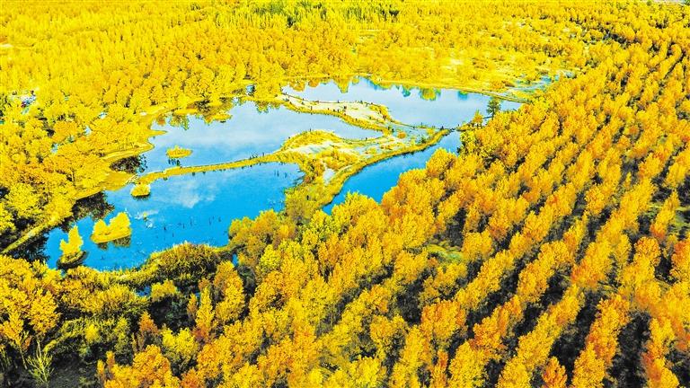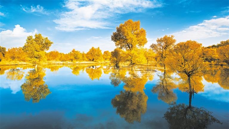 站在金波湖邊,滿目的赤橙黃綠與盈盈秋水互相映襯,胡楊金色的葉子倒映在潭水中,形成金色的水泊,微風(fēng)掠過(guò),層層漣漪漸漸擴(kuò)大,最后消失在胡楊的倩影里,構(gòu)成一幅幅精美的油畫(huà)。烘托出一幅“碧云天、黃葉地、秋色連波、波上寒煙翠”的絕美妙油畫(huà)卷。