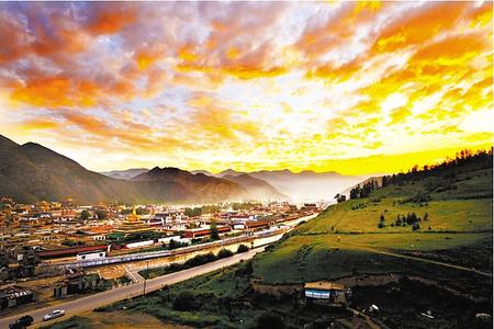 一路向南,下午到達(dá)甘南藏族自治州的夏河縣,還沒(méi)下車(chē),濃郁的民族風(fēng)情撲面而來(lái),隨處可見(jiàn)經(jīng)幡、寺廟和五色斑斕的風(fēng)馬旗。這里有世界最大的喇嘛教學(xué)府——拉卜楞寺,據(jù)說(shuō)規(guī)模僅次于布達(dá)拉宮。此時(shí)已近黃昏,晚霞為眼前的拉卜楞寺鍍上了一層金色的光輝,愈顯得富麗莊嚴(yán)。