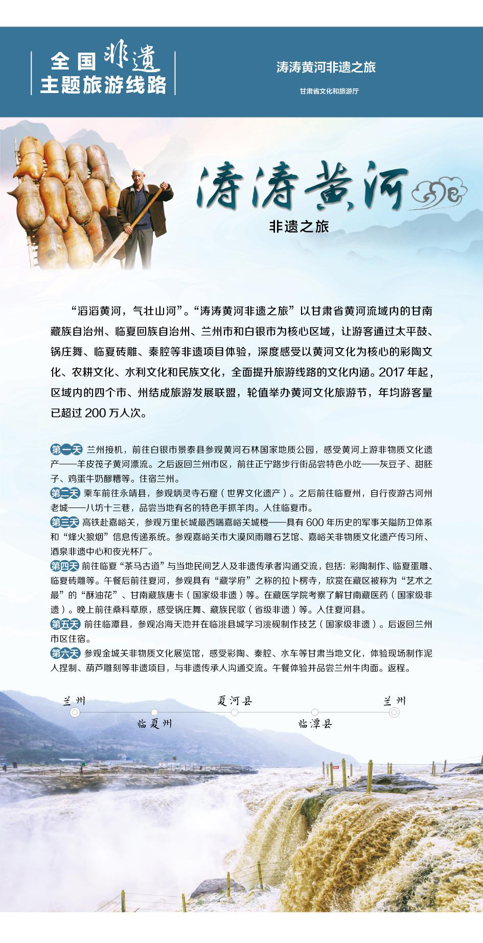 中國甘肅網(wǎng)10月19日訊 (本網(wǎng)記者 張?zhí)m琴)10月18日,在貴州舉辦的“中國丹寨非遺周”活動期間,文旅部首次發(fā)布了“全國非遺主題旅游線路征集宣傳活動”入選線路名單。由甘肅省文旅廳組織選送的“交響絲路非遺之旅”和“濤濤黃河非遺之旅”2條非遺主題旅游線路同時入選,我省成為全國唯一入選兩條線路的省份。