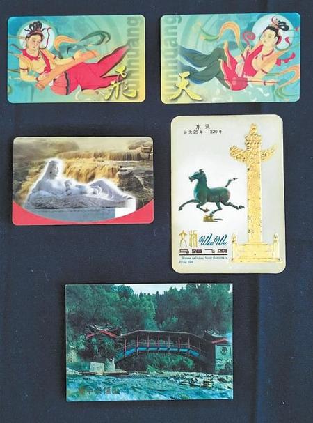 甘肅的自然風光優(yōu)美,人文歷史悠久,經(jīng)過不斷挖掘,精心保護,成為人們旅游、觀光的理想之地。北京中鈔信用卡廠于2001年制作的“飛”字片、“天”字片“飛天”對卡年歷片,中國工商銀行甘肅分行于2000年設計了《黃河母親》年歷片,中國農(nóng)業(yè)銀行甘肅分行于1987年設計的《興隆山握橋風光》年歷片,中國遠洋運輸公司上海分公司于1978年制作的《馬踏飛鳥》年歷片,都為甘肅旅游風光作了宣傳。