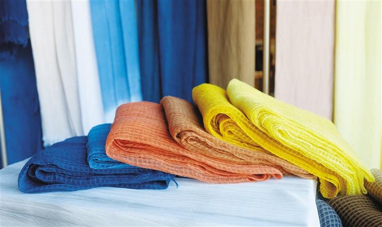 采用棉、毛、絲、麻幾種天然纖維,運用中藥材古法染色技藝制成。使用紅花染、黃檗染、藍靛染等染制出的成品絲巾色澤亮麗,質(zhì)感舒適,天然無污染。