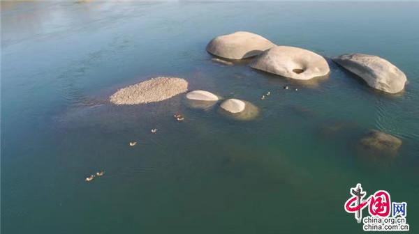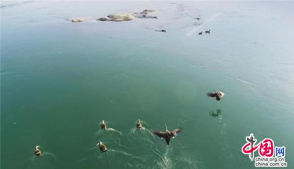 1月12日,在湖南桃江羞女湖國家濕地公園當?shù)財z影家協(xié)會成員用無人機有幸拍到一群正在資江戲水的野生保護物種——斑嘴鴨。