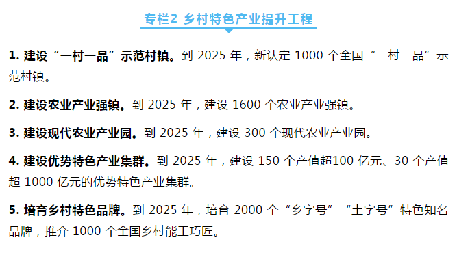 ——鄉(xiāng)村特色產(chǎn)業(yè)深度拓展。培育一批產(chǎn)值超百億元、千億元優(yōu)勢(shì)特色產(chǎn)業(yè)集群,建設(shè)一批產(chǎn)值超十億元農(nóng)業(yè)產(chǎn)業(yè)鎮(zhèn)(鄉(xiāng)),創(chuàng)響一批“鄉(xiāng)字號(hào)”“土字號(hào)”鄉(xiāng)土品牌。