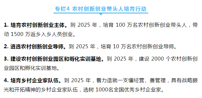 深入實(shí)施農(nóng)村創(chuàng)新創(chuàng)業(yè)帶頭人培育行動(dòng),加大扶持,培育一批扎根鄉(xiāng)村、服務(wù)農(nóng)業(yè)、帶動(dòng)農(nóng)民的創(chuàng)新創(chuàng)業(yè)群體。
