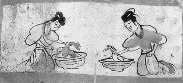 燙雞圖壁畫磚就出土于5號墓葬,這是繪制在一塊單塊磚面上的壁畫,磚面上用刷得甚薄的含膠白堊土作底,正中繪制二婢相對跪坐,袖子高高挽起,眉毛微撇,聚精會(huì)神地在各自的盆內(nèi)燙雞去毛。左邊盆內(nèi)雞有冠,為公雞形象;右邊盆內(nèi)雞無冠,似為母雞形象。用色較為單純,以墨、赭石和朱為主。畫面寥寥數(shù)筆,將婢女勞動(dòng)的情況表現(xiàn)得淋漓盡致,極具生活趣味。尤其是雞脖子被抓住的樣子非常傳神, 生動(dòng)地表現(xiàn)出寫實(shí)的情境。我們從中可以看到,1600多年前的人們殺雞處理食材,跟現(xiàn)在我們殺雞燙毛毫無二致。