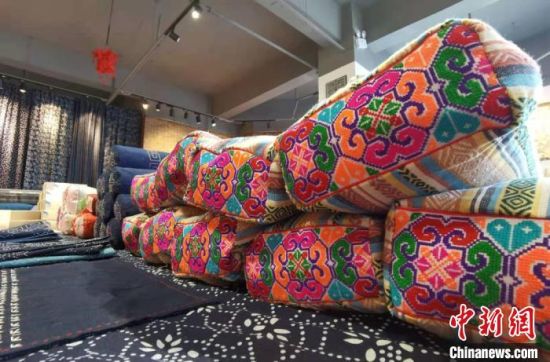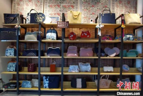近日,中新網(wǎng)記者在安定區(qū)一家非遺工坊內(nèi)見到祁輝,她身著正紅色漢服,腰間掛著香囊,穿梭于服飾區(qū)、布偶區(qū)和染布區(qū)之間。記者看到,工坊內(nèi)展出商品種類多樣,色彩豐富,包括潮流挎包、時尚發(fā)卡、卡通布偶、可愛抱枕,以及扎染服裝和圍巾等,在極具古風創(chuàng)意的同時,還不乏國潮設(shè)計理念。