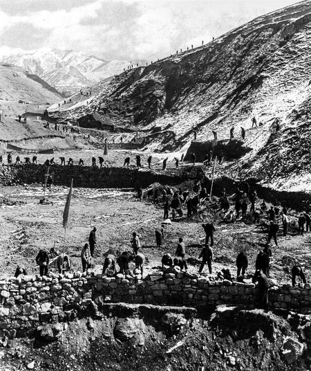 當(dāng)年莊浪縣鄭河公社上寨村村民大修梯田的場(chǎng)景。