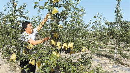 下午時(shí)分,在朱店鎮(zhèn)南部山區(qū)萬(wàn)畝產(chǎn)業(yè)示范基地里,果農(nóng)朱讀強(qiáng)正在自己的果園里忙碌著。他身后的15畝梯田果園里,蘋(píng)果樹(shù)已經(jīng)套袋結(jié)束。