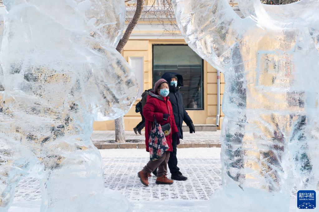 2021年12月30日,市民在哈爾濱中央大街觀看冰雕。