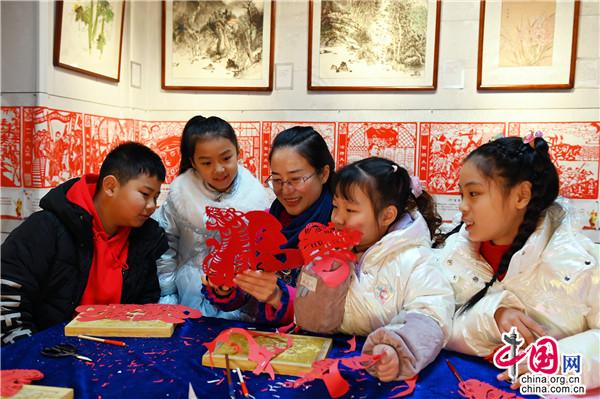 “?;⒆髌废盗卸际俏易约涸O(shè)計(jì)創(chuàng)作的,一共18款,每款的造型都不一樣。”1月26日,在位于湖南省新邵縣嚴(yán)塘鎮(zhèn)大源村的非遺剪紙展覽館,邵陽(yáng)剪紙非遺傳承人馬麗婭帶著幾名萌娃學(xué)習(xí)剪紙,為即將到來(lái)的虎年春節(jié)增添一抹喜慶。