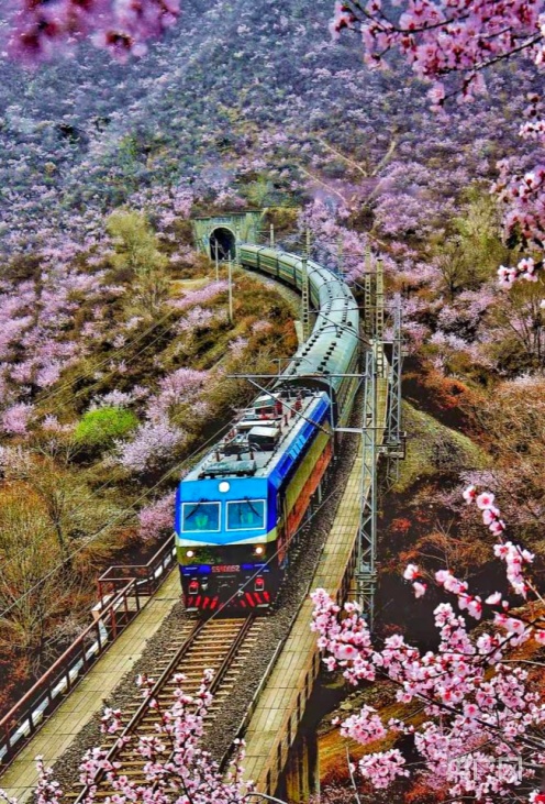 央廣網(wǎng)蘭州4月2日消息 (記者 邸文炯 通訊員 王紅剛 孫淑霞)近日,甘肅省崇信縣峽門寶中鐵路華亭市安口窯站附近的山上桃花盛開,花香四溢、如煙似霞?;疖噺纳街械乃淼来┬卸^,駛向一片春光燦爛。