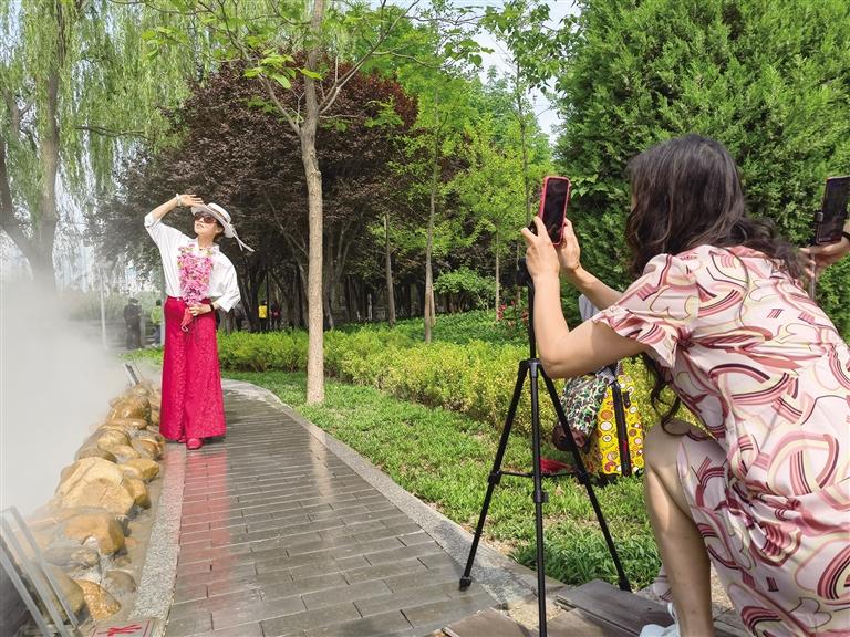 “一枝獨秀”團隊的王大姐和姐妹們帶著專屬攝影師正在這里攝影留念。王大姐告訴記者,這是她們今年第2次來這里打卡。“這里的花真美,每年我們都會來,拍照發(fā)在網(wǎng)上,收獲無數(shù)點贊,心情別提多美了。”說話間,姐妹們又擺了幾個造型,攝影師按下快門,精準捕捉唯美瞬間。“4公里外的寓言故事園最近也特別火,過兩天我們就去打卡。”王大姐說。