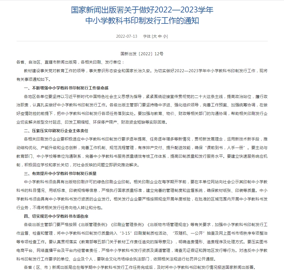 13日,國(guó)家新聞出版署網(wǎng)站發(fā)布《國(guó)家新聞出版署關(guān)于做好2022—2023學(xué)年中小學(xué)教科書印制發(fā)行工作的通知》(以下簡(jiǎn)稱《通知》)。其中強(qiáng)調(diào),各相關(guān)印刷發(fā)行企業(yè)要積極適應(yīng)中小學(xué)教科書印制發(fā)行要求逐年提高、任務(wù)逐年增多等新情況?!锻ㄖ返淖詈蟊硎?,要切實(shí)規(guī)范中小學(xué)教科書市場(chǎng)秩序。