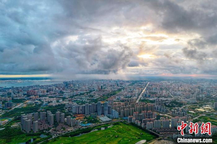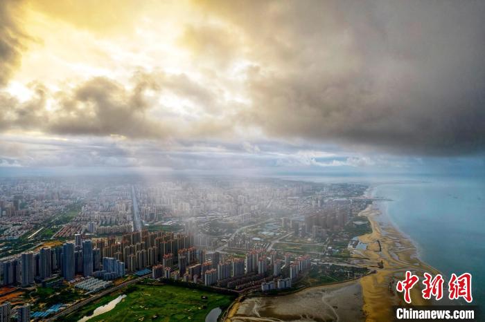 圖為陽光穿過云層照耀北海市城區(qū)。 徐紹榮 攝