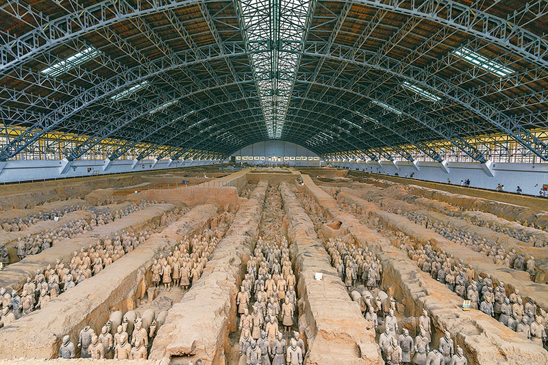 秦始皇陵是中國歷史上第一個(gè)多民族的中央集權(quán)國家的皇帝秦始皇于公元前246年至公元前208年?duì)I建的。作為秦始皇陵陪葬墓坑之一的兵馬俑坑于1974年被發(fā)現(xiàn),被譽(yù)為“世界第八大奇跡”。圖為秦始皇兵馬俑博物館一號坑全景?!∪嗣駡D片 丁俊豪/攝
