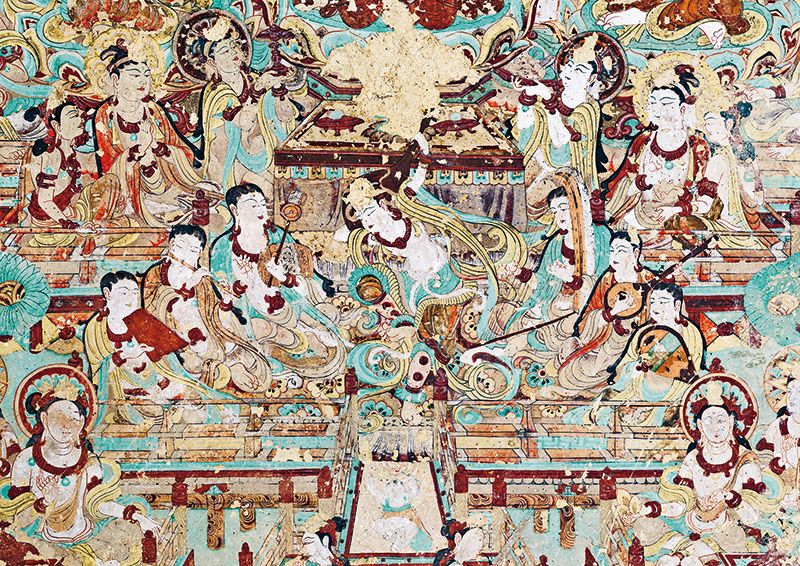 敦煌文化延續(xù)近兩千年,是世界現(xiàn)存規(guī)模最大、延續(xù)時(shí)間最長、內(nèi)容最豐富、保存最完整的藝術(shù)寶庫,是世界文明長河中的一顆璀璨明珠,也是研究我國古代各民族政治、經(jīng)濟(jì)、軍事、文化、藝術(shù)的珍貴史料。圖為莫高窟第112窟南壁壁畫“反彈琵琶樂舞圖”。 敦煌研究院供圖