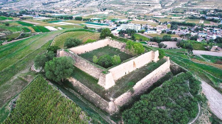 漫步騾子灘,附近的水家坡堡子也值得一去。這個堡子呈正方形,占地超4畝,不管從哪個視角看,都稱得上震撼。堡子分上下兩層,下層高5米、寬5米、邊長55米,上層高6米、底部厚3.5米、頂部厚2米、邊長35.5米。堡子外圍修有一圈寬5米、深6米、總長230余米的壕溝,曾為護城河。堡子約建于1946-1948年間,用來辦公和防御戰(zhàn)爭。1949年8月,解放軍在水家坡地界圍剿國民黨馬步芳部隊,經(jīng)過一天一夜戰(zhàn)斗,馬步芳部隊潰敗逃往新營方向,當(dāng)時有一發(fā)炮彈落在堡子一角,至今炮坑清晰可見。