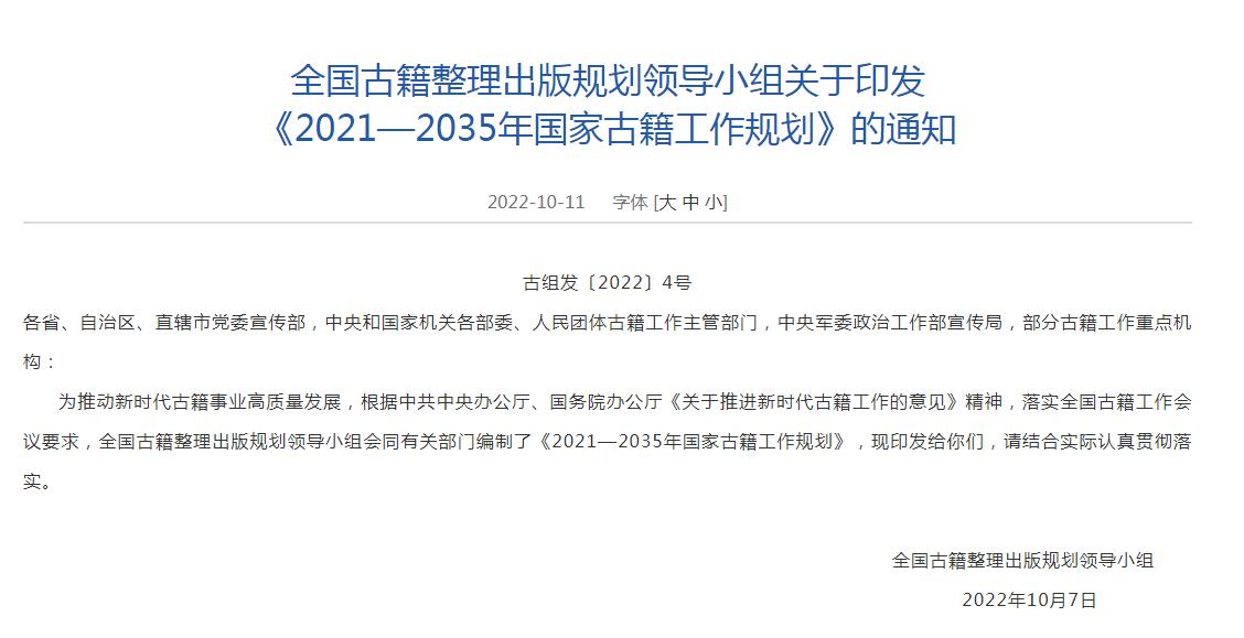 根據(jù)規(guī)劃,到2035年,古籍工作體制機制更加完善,標準規(guī)范體系基本健全,古籍保護、 整理研究和編輯出版成果豐碩,質(zhì)量明顯提升,古籍數(shù)字化資源建設取得重要進展, 古籍普及深入推進,人才隊伍發(fā)展壯大,古籍工作在傳承和弘揚中華優(yōu)秀傳統(tǒng)文化中的作用更加突出。