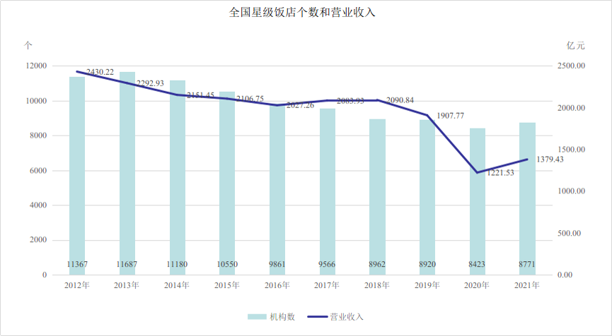 數(shù)據(jù)顯示,截至2021年,全國星級飯店總數(shù)達(dá)到8771個(gè),營業(yè)收入達(dá)到1379.43億元。