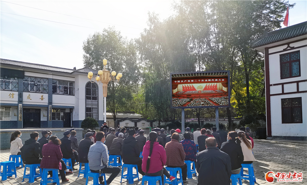 平?jīng)鍪袥艽h汭豐鎮(zhèn)鄭家溝村干部群眾早早來(lái)到村公共服務(wù)中心廣場(chǎng),通過(guò)大屏幕收看大會(huì)開(kāi)幕盛況。