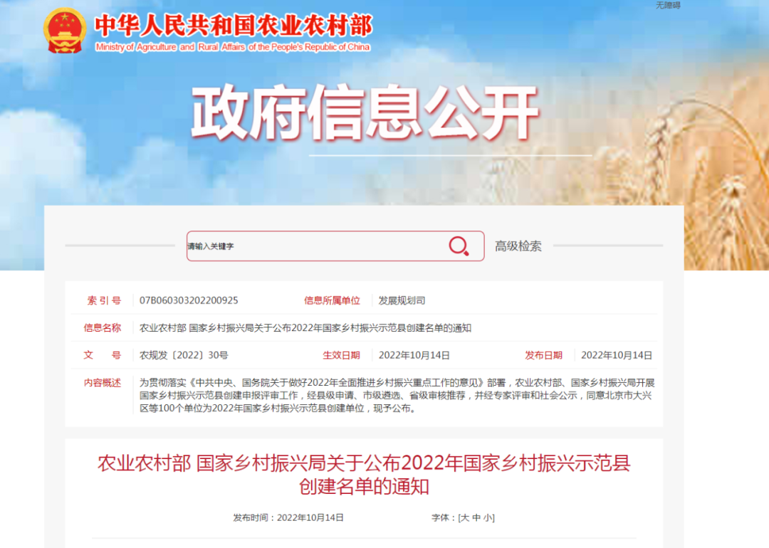 農(nóng)業(yè)農(nóng)村部、國家鄉(xiāng)村振興局開展的國家鄉(xiāng)村振興示范縣創(chuàng)建申報(bào)評審工作近日完成,北京市大興區(qū)、河南省蘭考縣、四川省眉山市東坡區(qū)等100個(gè)單位為2022年國家鄉(xiāng)村振興示范縣。其中甘肅省會寧縣、民勤縣、臨澤縣三地上榜。