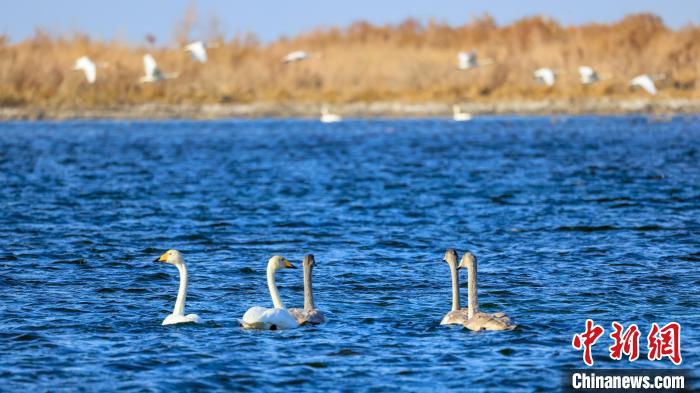 中新網(wǎng)烏魯木齊11月15日電(年磊)11月14日,位于新疆維吾爾自治區(qū)巴音郭楞蒙古自治州博湖縣境內(nèi)的博斯騰湖白鷺洲迎來大批天鵝,它們?nèi)宄扇航Y(jié)伴游弋,嬉戲追逐,優(yōu)雅的身姿成為博斯騰湖一道靈動(dòng)的風(fēng)景線。