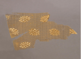 【粧金紗·元代·漳縣汪世顯家族墓出土】該墓葬中同時(shí)出土了許多元代的高級絲織品。此件粧金紗就是其中高級緞紋織物的一種。如棕色團(tuán)花粧金緞、粧金或銀天馬紋緞、粧銀簇花文緞等等。它不僅是罕見的早期緞物標(biāo)本,而且花色品種很多,非常珍貴。