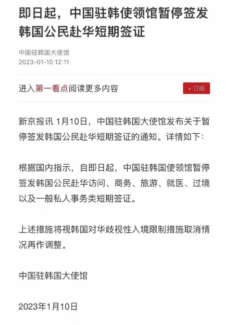 今天,中國(guó)駐韓國(guó)大使館發(fā)布《關(guān)于暫停簽發(fā)韓國(guó)公民赴華短期簽證的通知》(以下簡(jiǎn)稱《通知》)。通知稱,根據(jù)國(guó)內(nèi)指示,自即日起,中國(guó)駐韓國(guó)使領(lǐng)館暫停簽發(fā)韓國(guó)公民赴華訪問(wèn)、商務(wù)、旅游、就醫(yī)、過(guò)境以及一般私人事務(wù)類短期簽證。