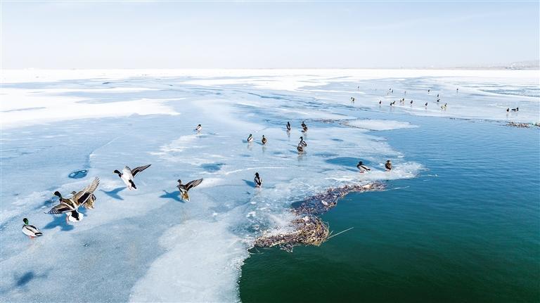 中國甘肅網2月3日訊 據蘭州晚報報道(通訊員 李永華 魏生明 記者 高慧霞 攝)2月2日,位于金塔縣的解放村水庫,越冬候鳥綠頭鴨、赤麻鴨成群結隊。隨著金塔縣生態(tài)環(huán)境的持續(xù)改善和好轉,近幾年過境候鳥數(shù)量持續(xù)升高,每年冬天都有綠頭鴨、赤麻鴨等鳥類遷徙到解放村水庫等濕地越冬。