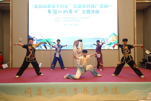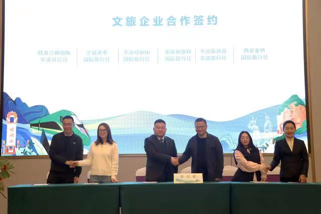 專題推介會上,平?jīng)鍪形幕瘡V電和旅游局推介了全市文旅資源及“引客入平”系列支持政策,崆峒山、大云寺·王母宮、龍泉寺、云崖寺等重點景區(qū)和涇川橙香瑤池溫泉酒店分別作了主題推介。平?jīng)鑫穆猛豆九c西安一帶一路文旅公司、涇川大云恒盛旅游公司與西安黃河國旅、崇信公劉文旅投公司與寶雞春暉旅行社、莊浪關山文旅投公司與寧夏新文化國旅、崆峒山國旅與重慶新旅程國旅、甘肅蘭神國旅平?jīng)龇止九c寧夏港中國旅、平?jīng)雎糜伟偈峦ㄅc西安金橋國旅等14家省內外旅行社分別簽訂“引客入平”客源互送合作協(xié)議。推介環(huán)節(jié)還進行了《神仙留戀的好地方》《崆峒武術魂》《折柳》和《春天的芭蕾》等文藝表演,與會嘉賓參觀了“問道崆峒·養(yǎng)生平?jīng)?rdquo;文旅形象圖片展、文旅產品市集、非遺技藝展示及網(wǎng)絡直播和非遺文創(chuàng)產品展。甘肅省文旅廳有關處室、各相關市州文旅部門負責人和省內外旅行商、文旅企業(yè)、媒體記者代表,平?jīng)鍪兄攸c景區(qū)、文旅投公司、文創(chuàng)企業(yè)代表共150余人參加。