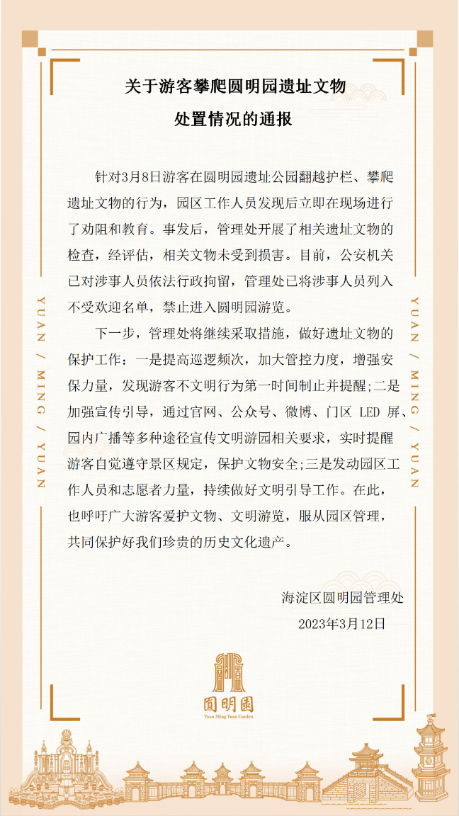 《通報》指出,針對3月8日游客在圓明園遺址公園翻越護欄、攀爬遺址文物的行為,園區(qū)工作人員發(fā)現后立即在現場進行了勸阻和教育。事發(fā)后,管理處開展了相關遺址文物的檢查,經評估,相關文物未受到損害。目前,公安機關已對涉事人員依法行政拘留,管理處已將涉事人員列入不受歡迎名單,禁止進入圓明園游覽。
