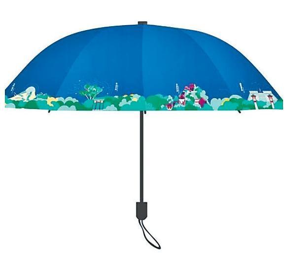 畫(huà)面是對(duì)天水文化的整合轉(zhuǎn)譯。靜謐的深藍(lán)夜色宛如舒緩溫柔的吟唱,點(diǎn)醒具有暗語(yǔ)的想象。連綿起伏的綠影又將目不暇接的八美之景串聯(lián)起墜于傘邊沿,呈現(xiàn)一種清新淡雅的格調(diào)。四字榜題作為光影與畫(huà)面間的調(diào)和劑潤(rùn)化了視覺(jué)美感,使空間溢滿文人逸趣。簡(jiǎn)潔平穩(wěn)的畫(huà)卷里隱含古雅山水的形象,靈動(dòng)漂浮的畫(huà)卷里創(chuàng)立起意蘊(yùn)美學(xué)。