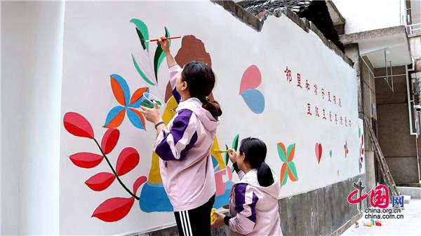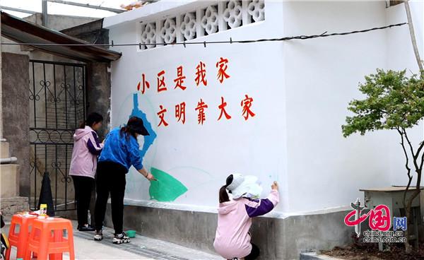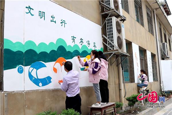 現(xiàn)場,大家手持畫筆和顏料板,相互分工協(xié)作,以墻為紙,認真細致的設計墻繪內容,筆起筆落間,一幅幅栩栩如生、色彩絢麗的城市文明新畫卷躍然墻上。