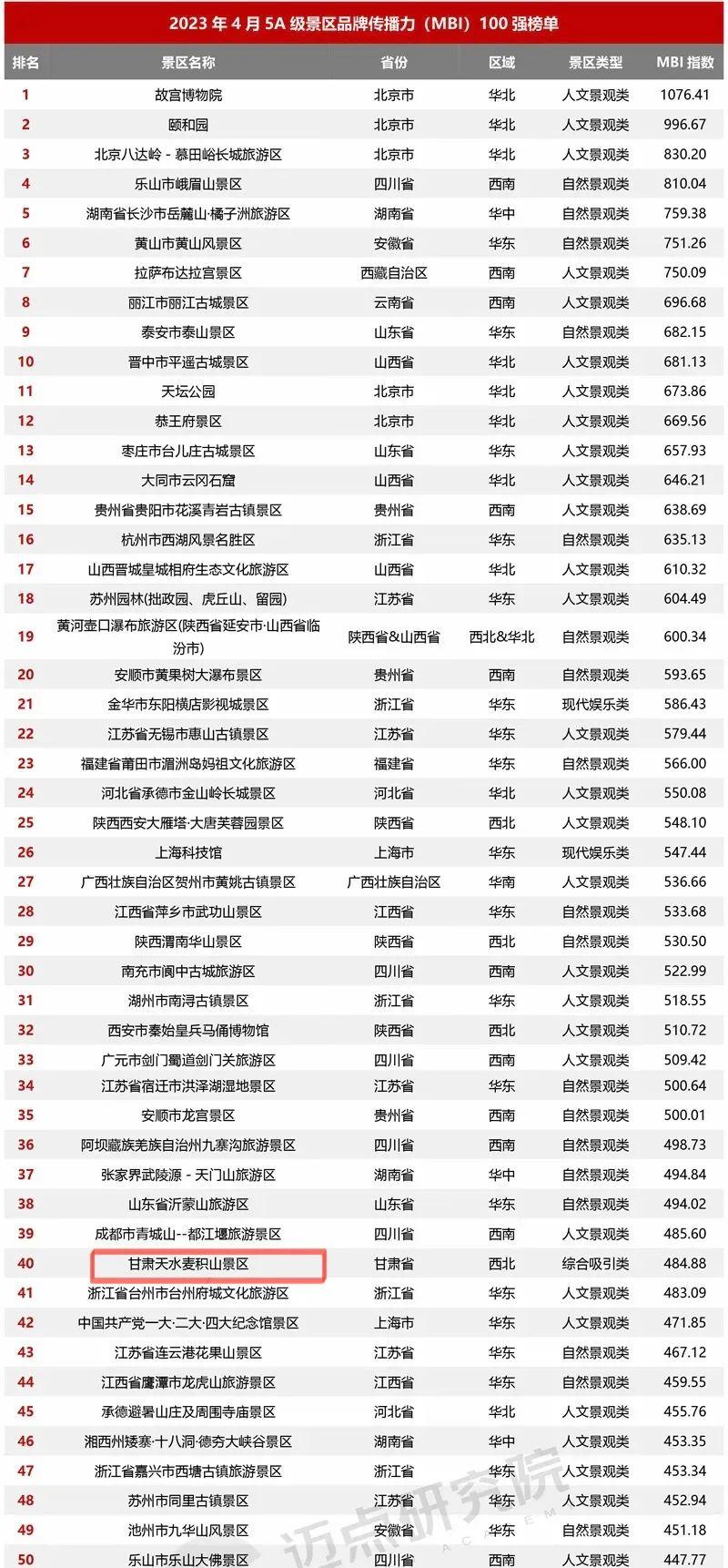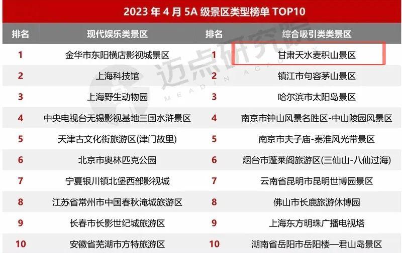 2023年4月5A級(jí)景區(qū)品牌傳播力100強(qiáng)榜單上,熱烈祝賀麥積山景區(qū)榮登國(guó)內(nèi)文旅行業(yè)最具影響力的權(quán)威數(shù)據(jù)分析機(jī)構(gòu)“邁點(diǎn)研究院”4月5A級(jí)旅游景區(qū)品牌傳播力百強(qiáng)榜單前五十和綜合類旅游景區(qū)第一、西北地區(qū)分項(xiàng)榜單第五。