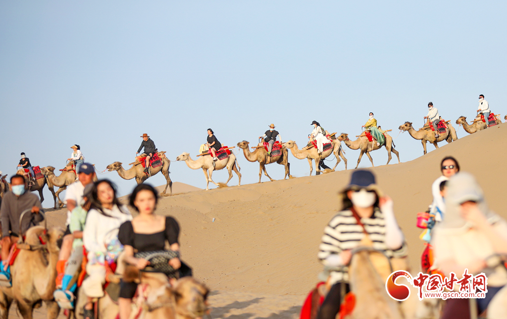 眼下正值甘肅省敦煌市旅游旺季,鳴沙山月牙泉景區(qū)持續(xù)吸引游客前來參觀游覽,這些駱駝每天更忙碌也更規(guī)律——早晨六點(diǎn)多“上班”,輪流休息,傍晚七點(diǎn)多“下班”。蜿蜒的駝隊(duì)在駝道上馱著游客在沙漠中漫步,成為鳴沙山月牙泉景區(qū)一道優(yōu)美的風(fēng)景線。